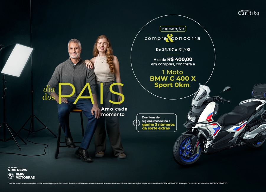 No Shopping Curitiba, o Dia dos Pais é celebrado durante todo o mês. A campanha promocional segue à todo vapor, até o dia 31 de agosto, e irá sortear uma moto BMW C 400 X Sport 0km. O modelo é ideal para a cidade, com design robusto, conectividade, potência e muito conforto. A cada R$ 400 em compras nas lojas participantes, o cliente poderá trocar por um número da sorte.